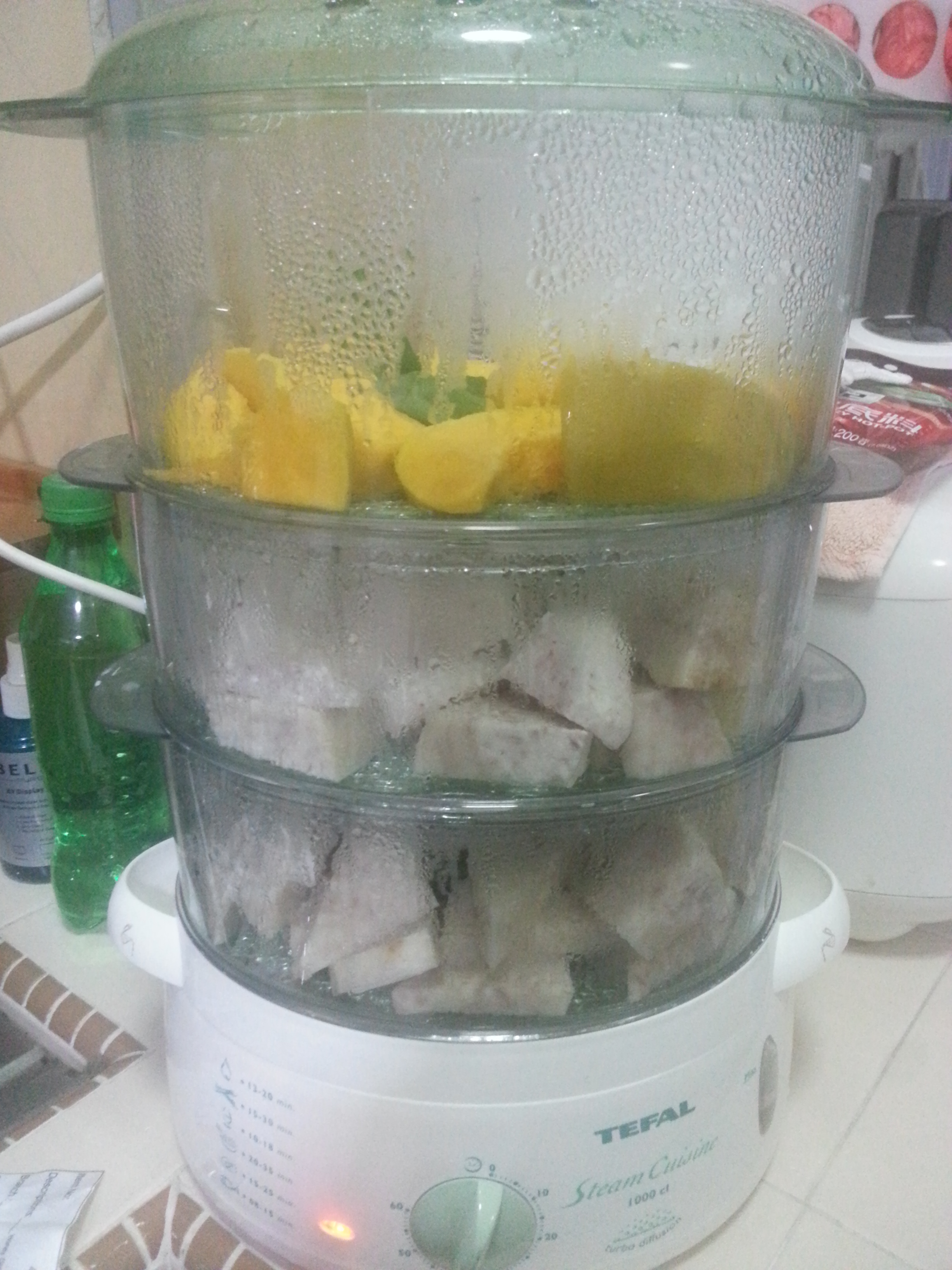 Our ever-handy steamer had a huge role to play when we steamed the yam and pumpkins. If you don’t have one of these, I highly recommend it. Turns out, it’s not only used for Cupped Corns. It’s healthy and a breeze to handle. We prefer using it to heat up food to the microwave (yes, we still use one. The horrors!!) on days when we have slightly more time because it heats up really quick.